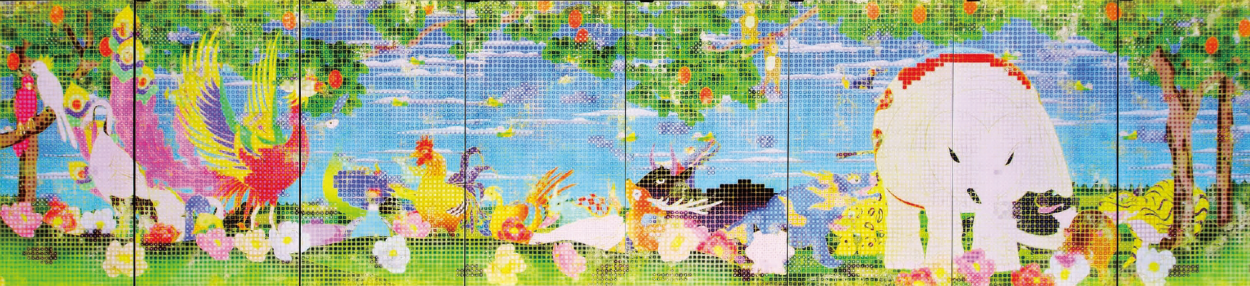 伊藤若冲(1716-1800)は、近世日本の絵師の一人。江戸時代中期の京都にて活躍した。若冲は、画面全体を数万もの升の形に区切って升目ごとに彩色する、「升目画」という特異な表現方法を残している。本作品は「鳥獣花木図屏風」や「樹花鳥獣図屏風」をモチーフにしている。