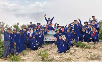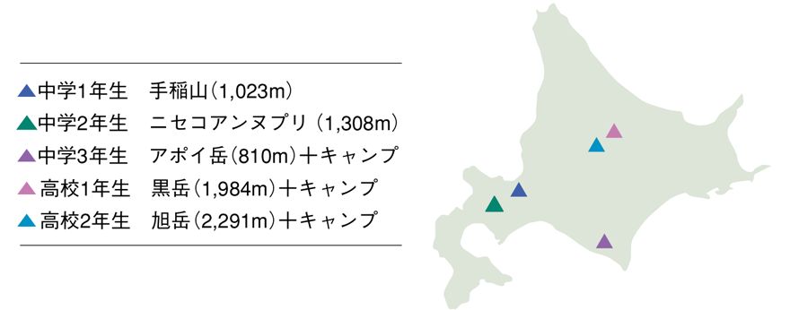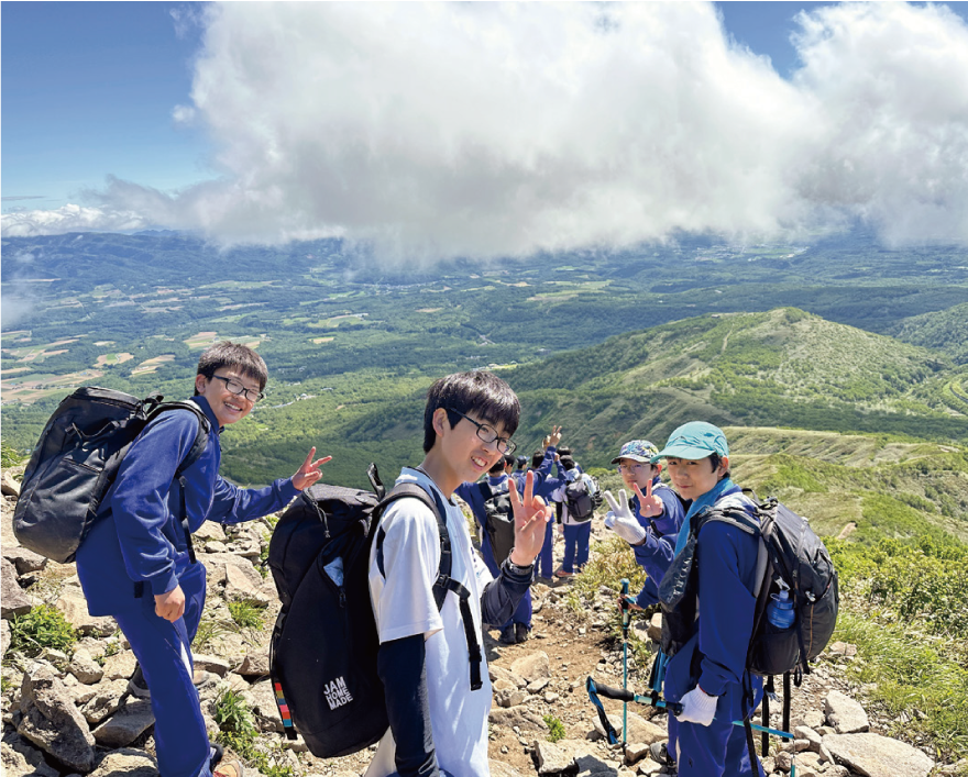 北海道の雄大な自然に囲まれた山々の頂上を仲間とともにめざし、協調性や自己に打ち克つ力を養成します。学年が上がるにつれて難易度の高い山に挑戦し、集大成となる高校2年生では、北海道で最も標高が高い「旭岳」の山頂をめざします。中学3年生からはキャンプも同時に実施し、自炊を行うなどの本格的なアウトドア体験を行います。自然の中で仲間と寝食をともにし、登頂した時の達成感や一体感は、大切な仲間との絆をより一層深めるものとなります。