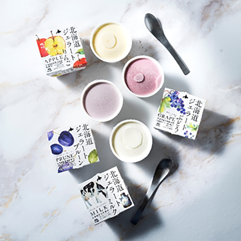 <北海道ジェラート> ・ミルク ・りんご ・ぶどう ・北海道産の生乳、北海道産のくだもの果汁を使用しています。