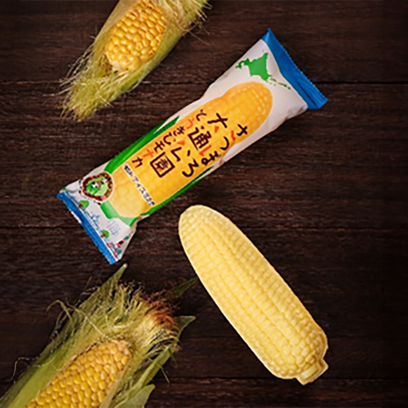 ●さっぽろ大通公園とうきびモナカ ・北海道産生乳100%使用。日高昆布醤油を使用した焼きとうきび風味のアイスモナカです。