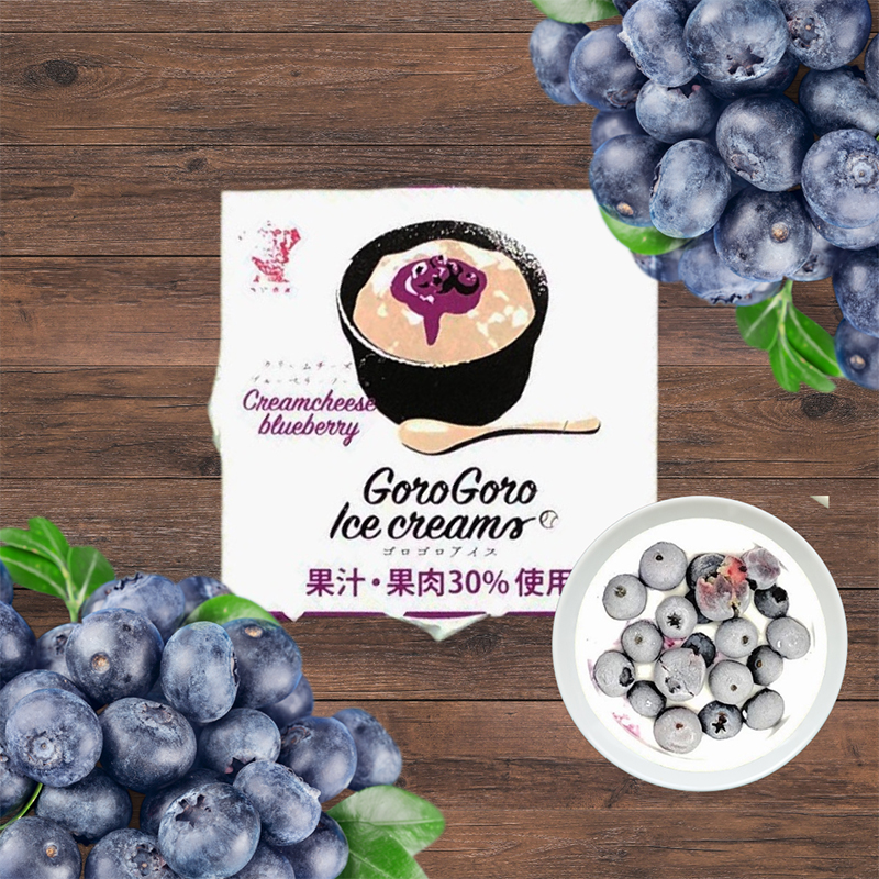 ●ゴロゴロアイス ・クリームチーズブルーベリー ・長沼町近郊の新鮮な牛乳を使用したアイスに、フルーツをゴロゴロたくさんトッピング。